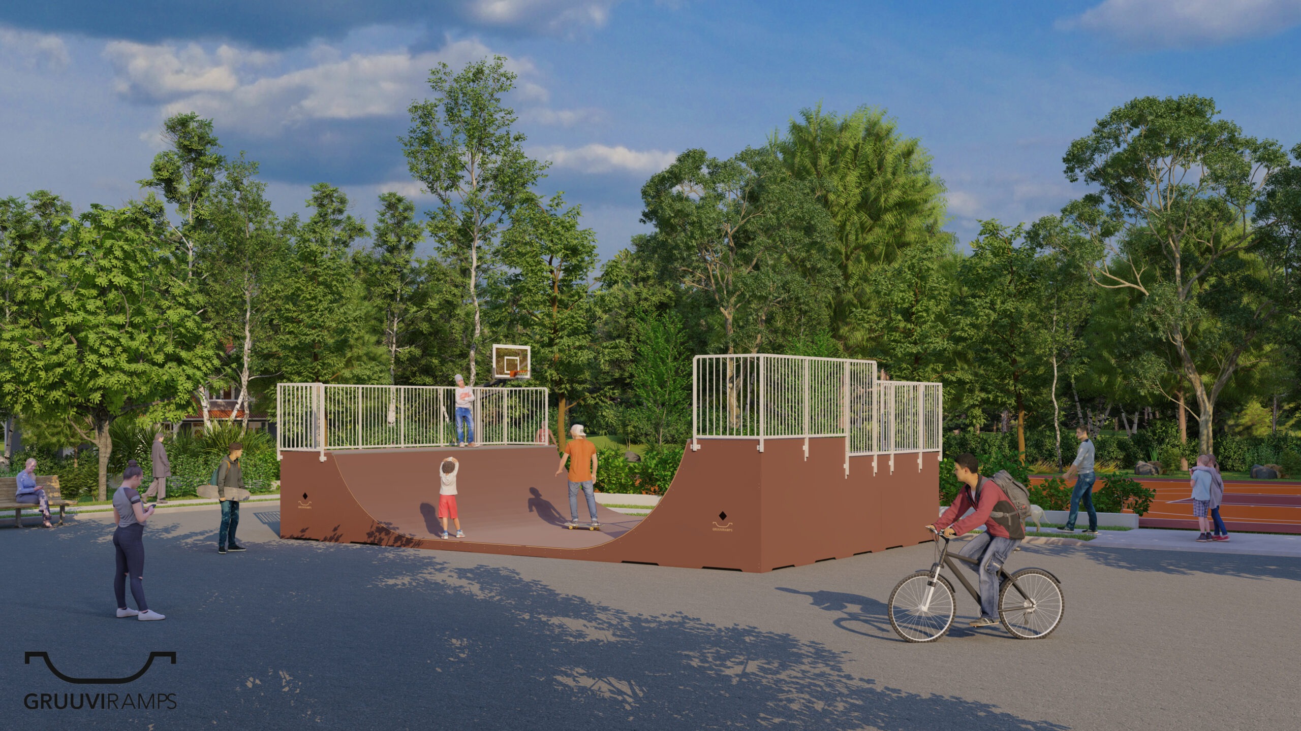 - Miniramp on tehtud välitingimustesse sobivatest ehitusmaterjalidest (veekindel vineer, sügavimmutatud puitmaterjal, välitingimuste puidukruvid jne).